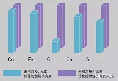 各个元素燃烧头高度优化得到的灵敏度(紫色)和只对Cu进行优化(青色)对比