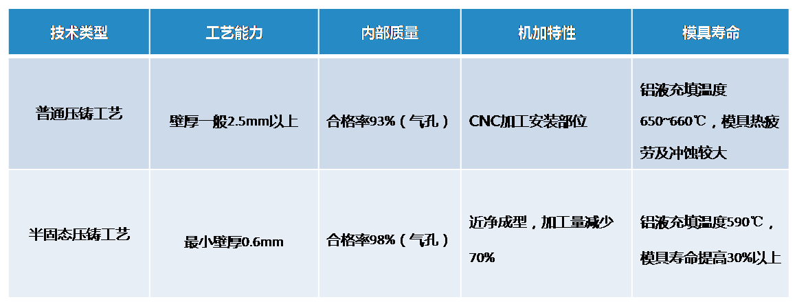 半固态成形关键技术在于一体化制浆工艺,形成性能独特的半固态浆料,具有更好的流动性能,更佳的微观组织,可以成形大尺寸、薄壁、结构复杂的轻量化铸件,同时,铸件的热裂、偏析、内应力大大减少,铸件尺寸精度高。半固态压铸成形具有高精度、短流程、节能、节材等优势,因而成为业界关注热点和重要选择。
