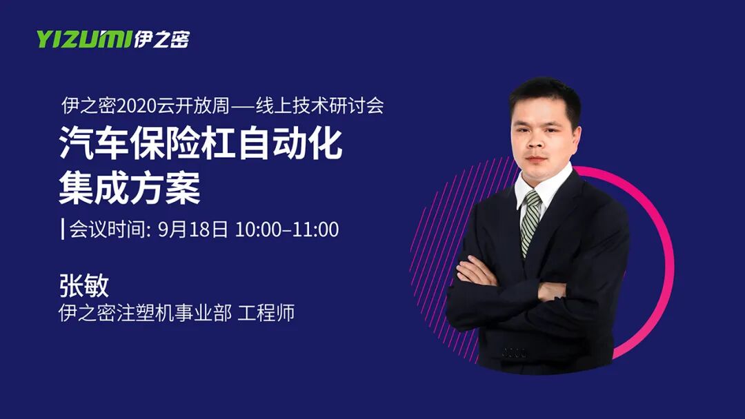 伊之密2020云开放周线上研讨会最后一天压轴主题依然分量十足!明天上午10点整,将由伊之密注塑机事业部工程师 张敏带来《汽车保险杠自动化集成方案》主题分享。