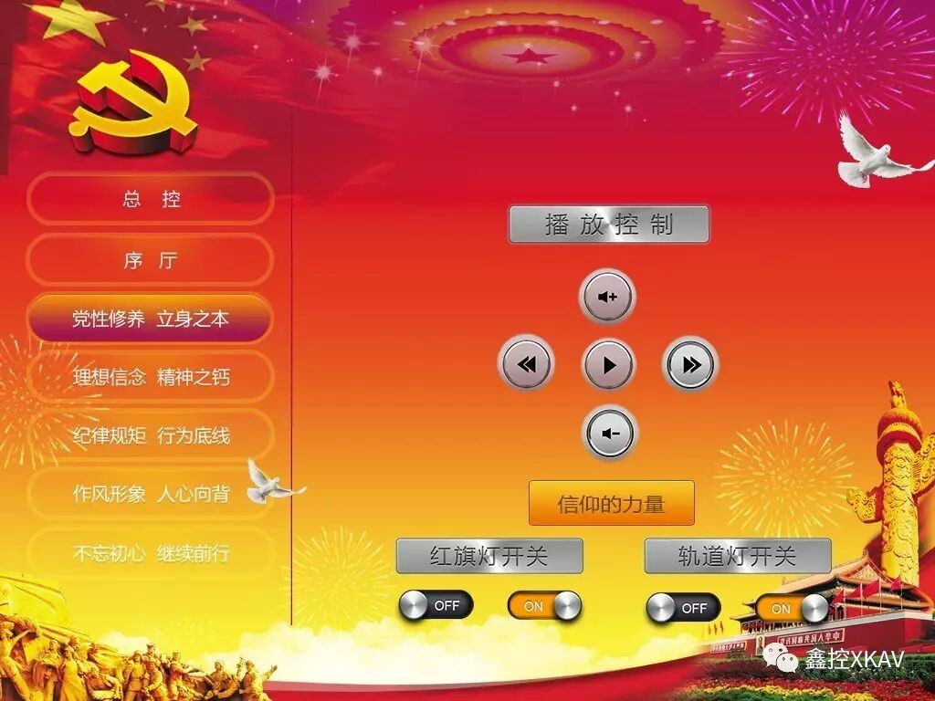 此区域功能:通过中控对视频实现播放、暂停、上一曲、下一曲、音量加、减等功能和对此区域的灯光进行开、关。