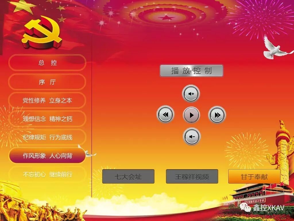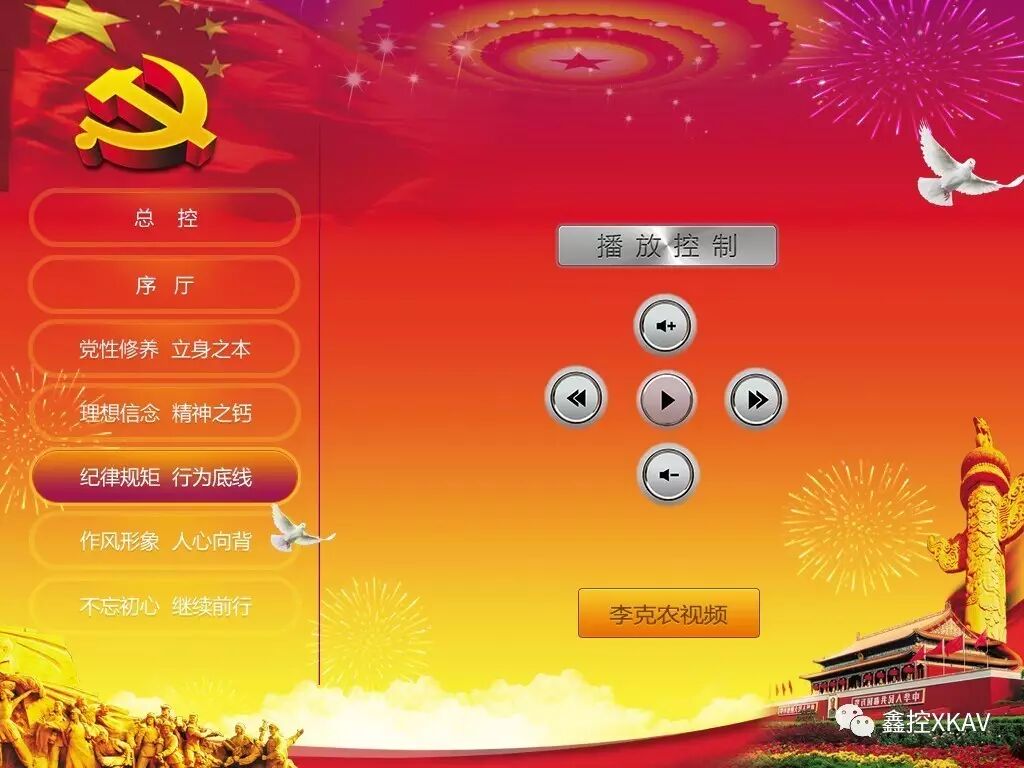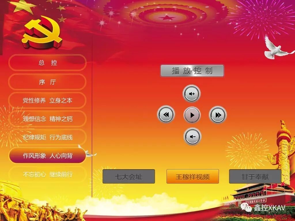 功能:通过中控对三大块的视频实现播放、暂停、上一曲、下一曲、音量加、减等功能和对此区域的灯光进行开、关。