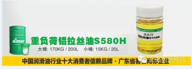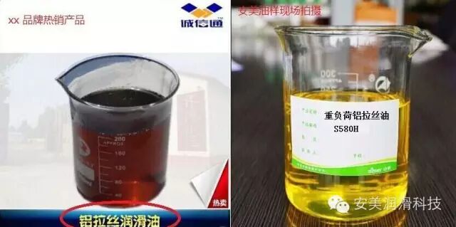 非标准基础油原本就含有一定的油泥、黄袍、金属杂质,这样就会导致铝拉丝油的沉降性能差、抗氧化性差。所以我们经常看到,采用非标油生产的铝拉丝油颜色是褐色、黄褐色、黑褐色的。而采用国标基础油生产的拉丝油都是金黄色、黄色、浅黄色(如安美S580H铝大拉油)或浅色透明(如安美S590铝小拉油)。油的颜色是非常漂亮的,类似我们烧菜的花生油、调和油。