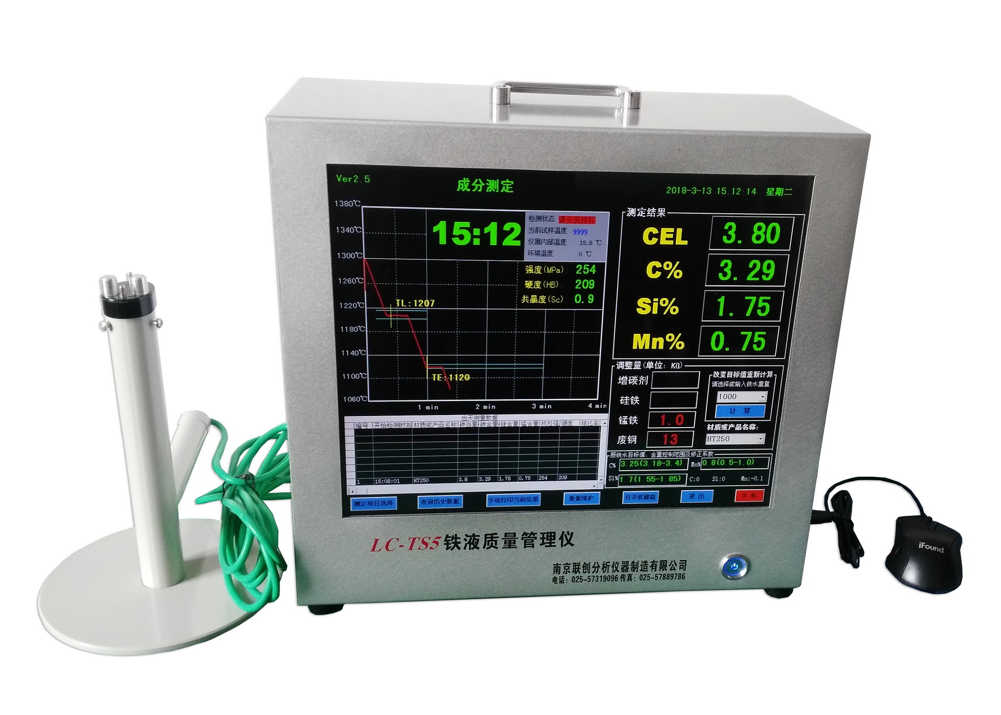 用于炉前快速测定灰铸铁和球墨铸铁铁水的碳当量CE%、碳含量C%、硅含量Si%、球化率SG%等铁水性能;预测普通灰铸铁的抗拉强度等。非专业人员经简单培训即可操作;在铁水可等待的时间内完成检测,然后根据自动计算出的增碳剂、硅铁、废钢投放量对铁水成份进行调整,有效的指导生产实践。