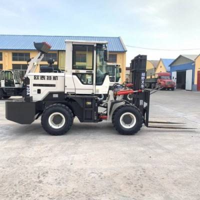 越野叉车从字面意思来看是一种越野能力很强的特种车辆,应用广泛,多用途越野叉车,是用于非公路运输、港口装卸和工厂搬运作业的多功能车辆,它集起重、装载和短距离输送于一体适合于路况条件较差的物资集散地装卸搬运车辆,具有较强的越野性、机动性、可靠性,采用内燃式柴油机提供动力,柴油机热效率高,功率高,排出的气体比汽油少,相对环保,越野叉车适合在恶劣环境下装卸搬运,还可以更换各种属具,多属具来满足不同需求,一车多用,越野叉车四轮驱动,底盘高,山地泥路崎岖道路作业,越野轮胎抓地力强,不打滑