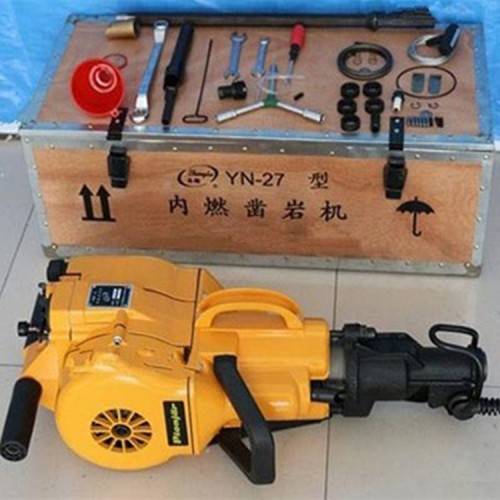 手持式内燃式凿岩机是一种由小型汽油发动机、压气机、凿岩机三位一体组合而成的手持式凿岩工具。用手握持,靠凿岩机自重或操作者施加推力进行凿岩的内燃凿岩机。YN27P内燃破碎镐具有钢筋混凝土、水泥路面、柏油路面、冻土层、冰层、软矿石、软岩层、道路施工等场合需要的劈裂、破碎、铲凿功能,广泛用于建筑施工、矿山、筑路、采石、消防救援破碎、国防工程、公路维护、各种清拆、打桩、固定帐篷、接地杆和探测地质污染破碎及铁道抢修工作等。内燃式凿岩机使用该机操作方便效率高等,并能和国际同类产品零件完全互换。 内燃凿岩机携带方便,适用于高山、无电源、无风压设备的地区和流动性较大的临时性工程尤为适合,具有广泛的适应性。