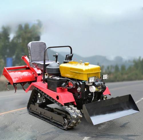 履带自走式旋耕机采用履带式行走机构,拖拉机驱动原理,采用独立三点悬挂,既是原始创造,又有多种耕作机械的功能集成,综合了各类机型的优点,既轻巧,而且履带接地面积大,弥补了轮式拖拉机水田通过性能的不足,配以柴油机为动力,换装不同的机具或刀片,即可进行旋耕作业,又可进行宽幅起垄作业。具有结构简单、功能广、效率高、操作方便、水田通过性能好等特点。