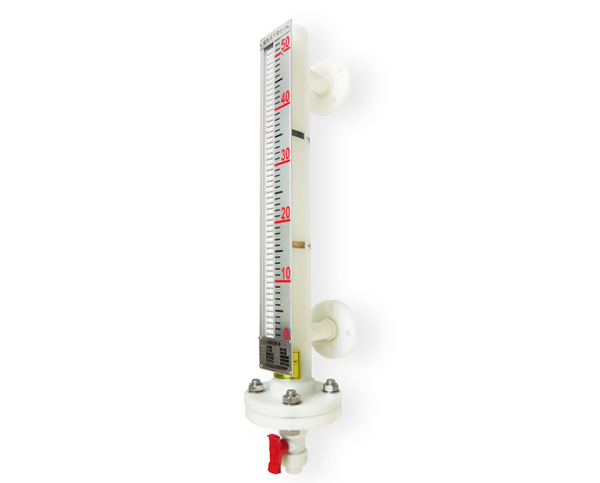 在您选用此产品前我们先将磁性翻柱液位计的工作原理作一简单的介绍。它有一容纳浮球的腔体我们称其为主体管或外壳,它通过法兰或其他接口与容器组成一个连通器;这样它腔体内的液面与容器内的液面是相同高度的,所以腔体内的浮球会随着容器内液面的升降而升降;这时候我们并不能看到液位,所以我们在腔体的外面装了一个翻柱显示器,因为我们在制造浮球时在浮球沉入液体与浮出部分的交界处安装了磁钢,它与浮球随液面升降时,它的磁性透过外壳传递给翻柱显示器,推动磁翻柱翻转180°;由于磁翻柱是有红、白两个半圆柱合成的圆柱体,所以翻转180°后朝向翻柱显示器外的会改变颜色(液面以下红色、以上白色),两色交界处即是液面的高度。