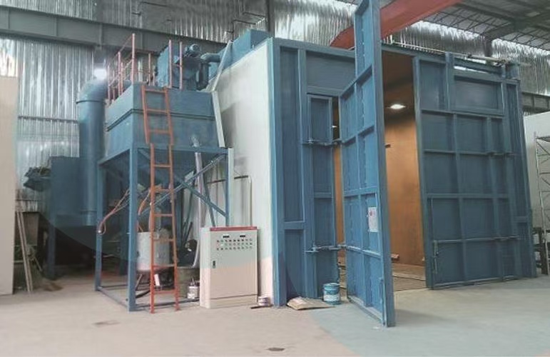 直接决*可容纳工件的*大外形尺寸,例如 12m×5m×4m 的喷砂房,可处理长度≤10m、宽度≤4m、高度≤3.5m 的工件(需预留喷枪操作空间)。
